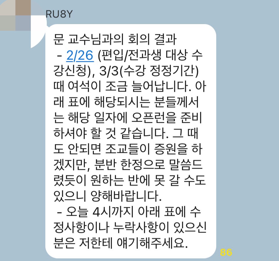 바로 조교님께 연락드려서 강좌 증원 요청을 해보았다. 휴,, 일단 일단락되었고 3월 3일에 결과가 잘 나오길 ㅠㅠ 김기석 교수님을 허고 싶었던 이유는 내가 일학년 때 범어도서관에서 그 분 특강을 한번 들었는데 되게 인상깊었어서,, 일단 너무 빡셀거 같아서 한번 보자구요!!